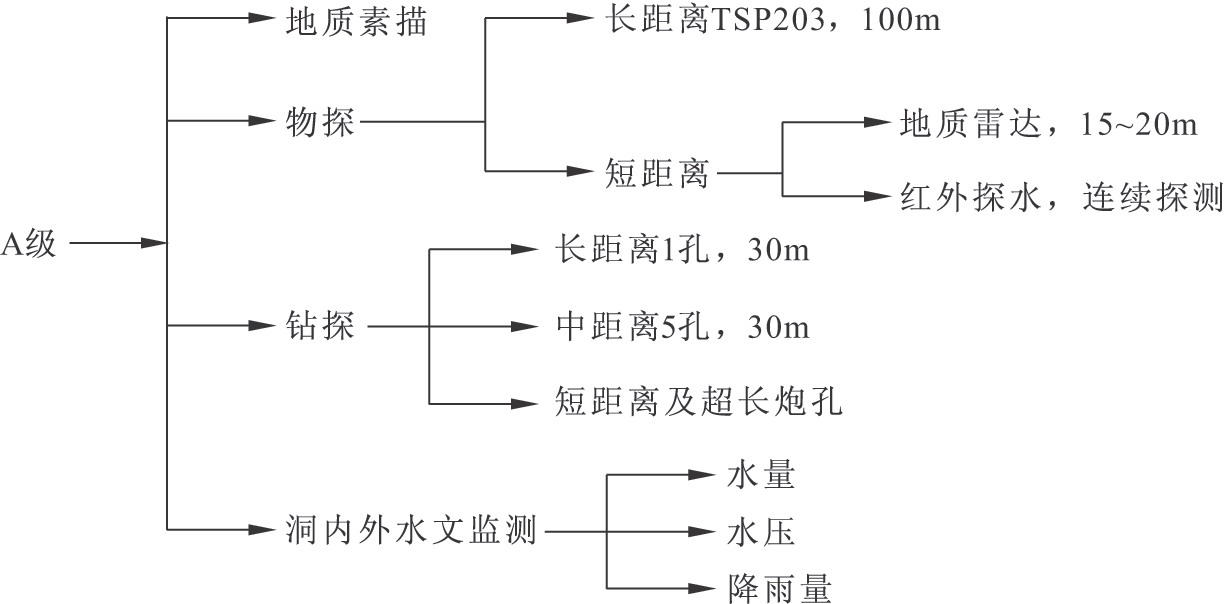 A級地段采用的方法組合為地質素描、物探(長距離探測TSP203探測,短距離地質雷達、紅外探水)、鉆探(長距離超前鉆孔1孔、中距離超前鉆孔5孔、短距離及超長炮孔)及水文監測(水量、水壓、降雨量)相結合的模式來實現(圖6-38)。其中TSP探測兩次之間需搭接10m,超前鉆孔兩次之間需搭接5m,超長炮孔(按探測方案:正洞17孔,平導9孔)和地質素描每施工循環(2~2.5m)一次。